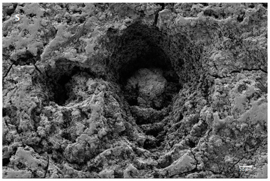 However, as seen in Figure 13, in the first 20 s, the energy released ratio is similar in both series R and S. The degree of porosity, unfused, and inclusions of SiC present in the S series do not seem to be important in this first stage, which is settled in the study by Berndt et al. [24] where the acoustic emission activity is due to micro cracking between pores as seen in Figure 8, and in “bridges” between fragments as shown in Figure 14. However, in the case of the bilayer, the dispersion of energy release is greater. This is attributed to the fact that after Mode I cracking, micro delaminations occur between layers with low energy, hence resulting in the diminution in energy and the larger dispersion in the energy release rate.