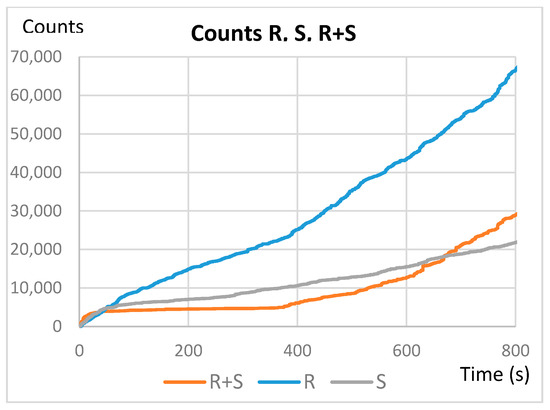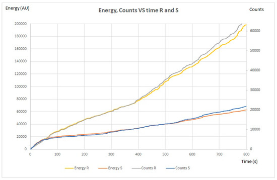 Figure 9 represents the mean behaviour of cumulative energy-counts vs. time series R and S of the six samples of the series studied. Examining the curves corresponding to the Al2O3/Y-TZP (yellow and grey), in the R series, there are two clearly identified zones: the first one, up to approximately 400 s, where the energy and the number of accounts is proportional with a ratio of 3.21; and the second, where the energy–account ratio is slightly lower with a value of 3.02, see Table 3.