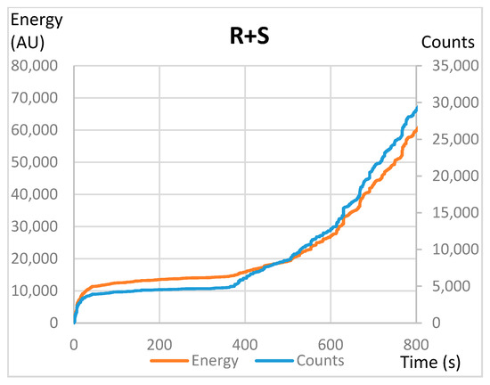 Cumulative energy counts vs. time of the R + S bilayer series.
