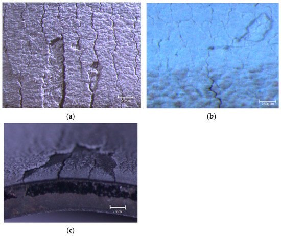A large concentration of events in the first 40 s are shown on Figure 7. That happens at forces lower than 470 N. Therefore, using Equation (1), at a load of 470 N, the effort in the layer of the thermal barrier is 333 MPa. Therefore, it is astonishing that mostly failure events appear from the beginning of the test up to 333 MPa, as opposed to the values presented by Kondoh et al. [19], where, for a material similar to that used, they obtained tensile creep stresses greater than 700 MPa. Additionally, Surgeon [20] finds events at high levels of effort in BMAS (barium magnesium aluminium silicate) reinforced. Likewise, Boatemaa [21] suggested that the magnitude of the residual effort in the deposited thermal barrier depends on the coefficient of thermal expansion and the elastic modulus of the material. This clearly indicates that the high density of discontinuities, unfused areas, and porosity are, per se, large stress concentrators, as shown in Figure 8. These microstructural residual tensions arise from the deposition process and thermal shocks, enhancing this poor behaviour.