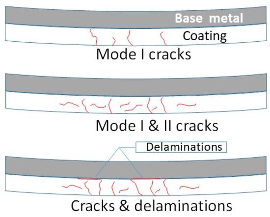 Figure 12 shows a scheme of the crack type in Modes I and II, and delaminations that arise in a TBC.