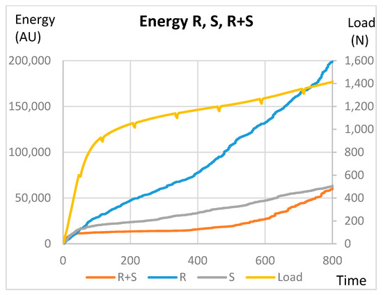 In all cases for series R (Y-TZP/Al2O3), S (Y-TZP/Al2O3 + 15% SiC), and R + S ((Y-TZP/Al2O3) + (Y-TZP/Al2O3 + 15% SiC)), in the first zone 0–20 s, the energy release is due to the formation of Mode I cracks in the ceramic. This is due to normal stresses in the ceramic layer. In the case of energy relationship events of 3.22 for the S series and 3.23 in the R, these values are basically similar. However, in the case of the R + S bilayer, this ratio is 2.92, which indicates that in this first stage, the energy release in general is less than in the previous ones. This phenomenon can be attributed to the creation of perpendicular cracks in Mode I, with an energy release similar to the previous ones. However, these cracks can trigger small cracks between layers with low energy release, which leads to the rise of energy release variation.