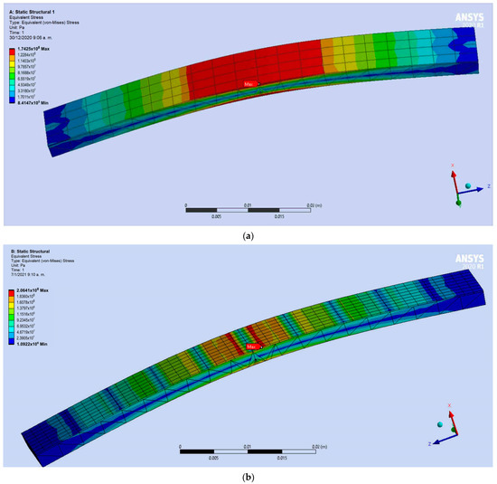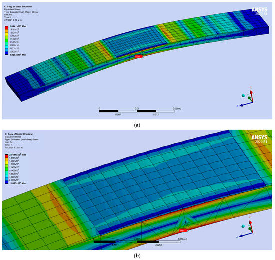 To corroborate the aforementioned, an ANSYS finite element simulation was performed on a model with a continuous barrier (Figure 16a) and with a segmented barrier of 10 mm in length (Figure 16b). The latter emulates the fragmentation presented in the S series, as seen in Figure 14. This model shows that just by sectioning the material into ten fragments, contrary to what might be expected, there is a slight stress increase in the ceramic coating approximately at one third of each section (Figure 16b). This certainly justifies the increase in energy release presented by the S series (Y-TZP/Al2O3 + 15% SiC) with respect to the R series in the second stage, because this is the triggering effect for fractures in Modes I and II with a higher energy level. It accords with Palacio [26], who points out that coating voids and cracks represent structure discontinuities, facilitating the development of stress gradients around such gaps, and increasing the sensitivity to localized damage in areas adjacent to discontinuities in the coating.