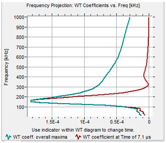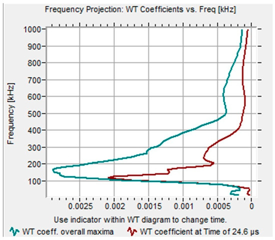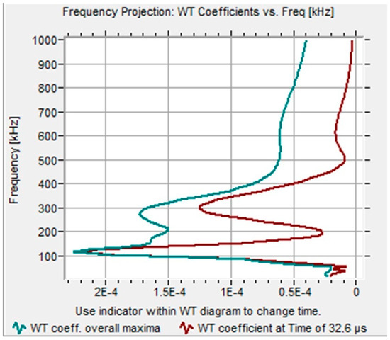 It is important to highlight that in the same event recorded, many patterns of frequencies are registered. This phenomenon can be observed in Figure 21a,b, where at 37.6 μs (red curve), Figure 21a, a Mode II crack (250 KHz) appears, triggering a delamination (600 KHz) at 53.4 μs as shown in Figure 21b.