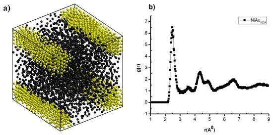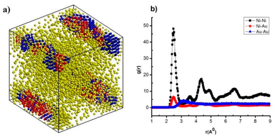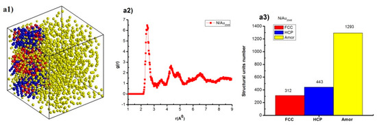 The result shows that NiAu5324 alloy at the heating rate of 4 × 1012 K/s has structural shapes (Figure 3a) corresponding with 03 links Ni-Ni, Au-Au: Ni- Ni is r = 2.47 Å, Ni-Au is r = 2.47 Å, Au-Au is r = 3.17 Å (Figure 3b), and expresses through structural unit number FCC (Figure 2a), HCP (Figure 2b), Amor (Figure 2c). The obtained results are consistent with the results of Ni-Ni by experimental methods r = 2.43 Å [82], and R = 1.245 Å, with the simulation method r = 2.45 Å [73], r = 2.52 Å [72], for Au-Au, only X-ray diffraction results in an atomic radius value R = 1.44 Å [83,84]. Increasing heating rate from 4 × 1012 K/s to 2 × 1013 K/s, 4 × 1013 K/s, 2 × 1014 K/s, and 4 × 1014 K/s leads to r of link Ni-Ni, Ni-Au, Au-Au change values. Besides, when Ni-Ni changes from r = 2.47 Å to r = 2.41 Å, Ni-Au decreases from r = 2.47 Å to r = 2.43 Å, Au-Au decreases from r = 3.17 Å to r = 3.09 Å, corresponding to the change of g(r) and structural unit number FCC, HCP, Amor; as FCC decreases from 802 to 0.0 FCC, HCP decreases from 811 HCP to 13 HCP, Amor increases from 3711 Amor to 5311 Amor (Table 3). That confirms that there is an increase in the heating rate when the crystallization process decreases.