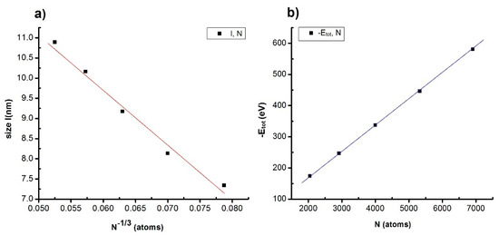 The given result shows that increasing N leads to l increase, and satisfy the formula: l = 18.021 − 138.153N−1/3, corresponding to l~N−1/3 (Figure 5a) and −Etot proportional to N (Figure 5b). The results are consistent with the results of crystallizing process temperature (Tm) proportional with N−1/3 [74,75] and size (l or D) proportional with N−1/3 [67,68,69,70,71,72,73]. This proves that increasing atom number leads to crystalline atoms number FCC, HCP increase, Amor decrease, size increase, the total energy of system decrease; and the relationship with l~N−1/3 is an important result for future experimental implementation.