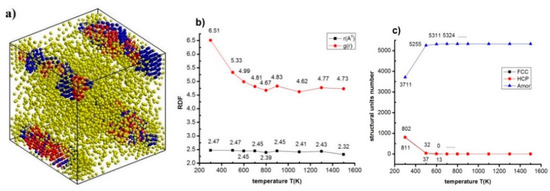 In it: , , r, N, ni(r), V, g(r) is the size, density, radial distance, the number of atoms, the coordinates, the volume, the probability of finding an atom in the distance from r to r + Δr. To determine the number of structural units, are applied the Common Neighborhood Analysis (CNA) method [100,101,102,103]. The crystallizing process is carried out based on the laws of Nosé el [104] and Hoover el [105] and uses the techniques of particle size analysis, atomic composition, and configuration [106].