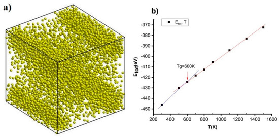 Increasing T from T = 300 K to T = 400 K, 500 K, 600 K, 700 K, 900 K, 1100 K, 1300 K, and 1500 K leads to l insignificant change range l = 7.34 nm to l = 7.35 nm and Etot increase from Etot = −446.0 eV to Etot = −430.2 eV, −424.3 eV, −418.2 eV, −415.6 eV, −405.5 eV, −394.2 eV, −383.1 eV, and −372.4 eV. In it, the structural shape of NiAu alloy at T = 700 K (Figure 7a) and an interrupting point at T = 600 K then corresponds with Etot = −418.2 eV observed at glass temperature (Tg), Tg = 600 K (Figure 7b). The results obtained show that, with T < 600 K, NiAu5324 alloy exists in the crystalline state and T > 600 K is in a liquid state, this result is completely consistent with the results obtained in on and are considered as the basis for future empirical research.