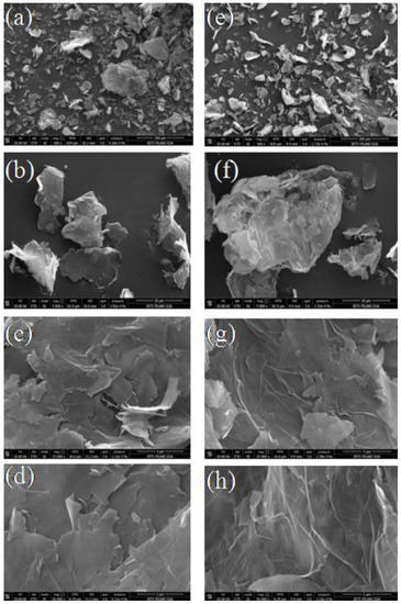 Figure 1. Field emission scanning electron microscope (FESEM) images of GNPs for each grade: (ad) H25 and (eh) M25 at 500× (a,e), 5000× (b,f), 25,000× (c,g) and 50,000× (d,h) magnifications.
