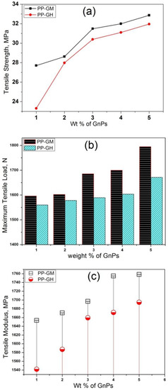Figure 2. (a) Tensile strength, (b) maximum tensile load, and (c) tensile modulus of the polypropylene (PP)/GNP nanocomposites as a function of the GNP content.