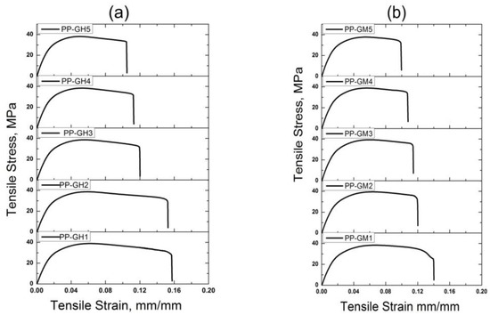 This is due to the high modulus of the GNPs, which causes improvement in stress transfer at the filler and polymer matrix interface. A similar trend was also noticed for maximum tensile load carrying capacity and Young’s modulus. The current outcomes are similar to the findings of several researchers [35,36]. The improved tensile properties are attributed to the increase in stiffness, which augments the adhesion between GNP particles and the PP matrix. The tensile strength increases from a minimum of 16 ± 1.5 MPa for virgin PP to approximately 33 ± 2.1 MPa for the PP-GM5 sample (more than 100% greater tensile strength). The GNP content alters the degree of dispersion and agglomeration and produces stiffer nanocomposites. Overall, the tensile strength, Young’s modulus, and maximum tensile load carrying capacity improved as the GNP content increased. However, it is important to mention that the magnitudes of these properties were always higher for the nanocomposites carrying M25 grade GNPs. As the GNP sheet thickness decreases there will be improved interfacial bonding between PP and GNPs, causing a further reduction in agglomeration. This causes to achieve high degree of dispersion as compared to nanocomposites made from H25-grade GNPs. The decrease in sheet thickness increases the efficiency of reinforcement. A relevant study conducted by Fu et al [37] and Greer et al [38] considered the effect of size alone. They revealed that, the mechanical property is inversely proportional to the size of the filler. When Young’s modulus is considered, a minimum value of ≈1413 MPa occurred for virgin PP. It increased up to ≈1695 MPa for the PP-GH5 composite, whereas a maximum value of ≈1759 MPa was reported for the PP-GM5 composite. The virgin PP carried a maximum tensile load of ≈1522 N and its capacity the increased to ≈1672 N and 1683 N for the PP-GH5 and PP-GM5 nanocomposites, respectively. The causes are obviously the increased surface areas that improved the efficiency of stress transfer between GNPs and the PP matrix. The high surface area for M25-grade GNPs increases the hindrance capacity for crack propagation, leading to an increase in strength [39]. The tensile stress–strain curves are shown in Figure 3. The virgin PP elongates up to 105% at breakage. Figure 3a,b show there is a significant decrease in elongation with increase in filler content. The % of elongation is 18% and is minimum for PP-GM5 nanocomposite, indicating it to be slightly ductile and tough composite. Reinforcing the M25-graded GNPs into the polymer matrix makes the composite more stiff as compared to filling the H2-graded GNPs, but on the other hand, decreases the stiffness to a great extent. This restricts the elongation and polymer chain movement.