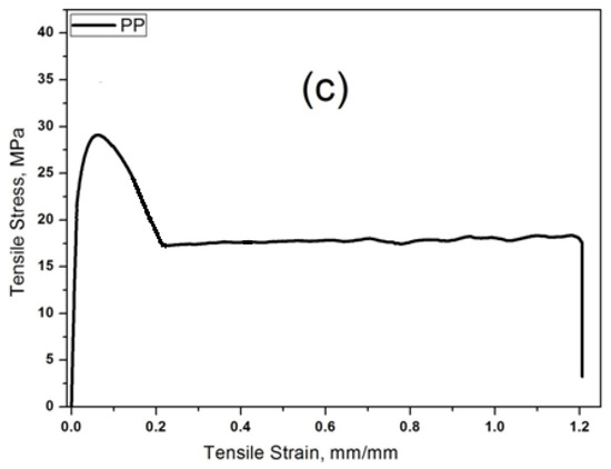Figure 3. Tensile stress–strain diagrams of (a) PP-GH and (b) PP-GM composites as a function of increasing amount of GNPs; (c) Virgin PP.