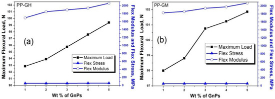 Figure 4. Flexural Strength, flexural modulus and maximum flexural load of (a) PP-GH and (b) PP-GM nanocomposites.