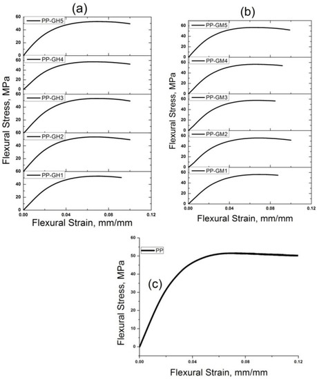 Figure 5. Flexural stress–strain curves of (a) PP-GH, (b) PP-GM nanocomposites, and (c) Virgin PP.