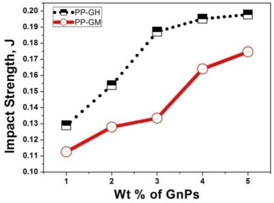 The influence of the GNP content on the impact strength is expressed in Figure 6, and the data are listed in the last column of Table 4. It is observed that there is a significant increase in impact strength with the GNP content, but it is to be noted that higher values are reported for H25-based polymer composites. The impact strength increased from 0.085 J for neat PP to 0.197 J (improved to 132%) for the PP-GH5 sample, but improvement up to 100% was seen for PP-GM5 composites. Loading thicker GNPs into the PP matrix caused graphene restacking by virtue of Van der Waals force of attraction within the particles and governing the impact strength. Graphene restacking for thicker GNPs decreased the energy dissipation during crack propagation, crack deflection and crack bridging [40,41].