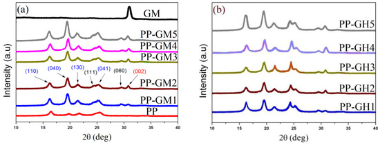 Figure 7 shows the XRD peaks for both neat PP and the prepared nanocomposites. The XRD of neat PP (Figure 7a) revealed the presence of α-form crystals. There were four peaks at 2θ values of 16.18, 19.32, 21.34, and 25.20. The PP peaks corresponded to (110), (040), (130), and (041) planes, respectively. No other crystal forms were observed for neat PP. The GNPs showed a single peak at 2θ = 30.72 and corresponded to the (002) plane due to the spacing between graphene units. As the GNPs were added, two new peaks appeared at 2θ angles of 24.28 and 29.43. These two peaks correspondedto the (111) and (060) planes of β-form crystals [42]. Therefore, the nanocomposites were dominated by the presence of α-form crystal peaks. In other words, reinforcing GNPs to PP boosts the crystallisation and helps to form different new crystals. The β crystals are formed for the nanocomposites with H25 and M25. Hence, it may be said that GNPs serve as nucleation sites in the polymer matrix [43,44], but strong β crystal peaks were observed for the polymer composite containing H25 at (111) plane.