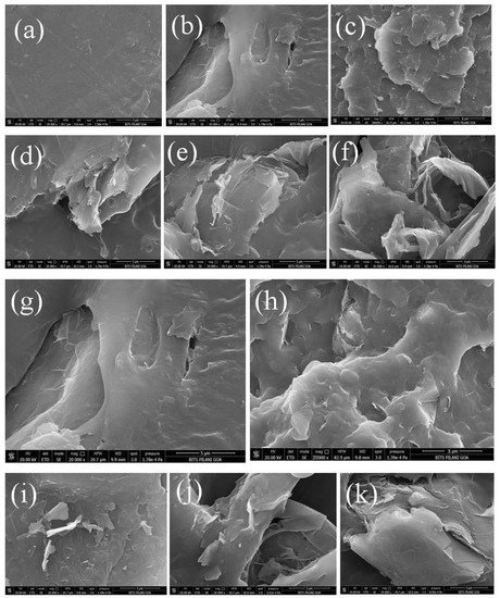Figure 8. FESEM images of (a) neat PP, (bf) PP-H25 and (gk) PP-M25 nanocomposites with 1, 2, 3, 4 and 5 wt% GNPs respectively.