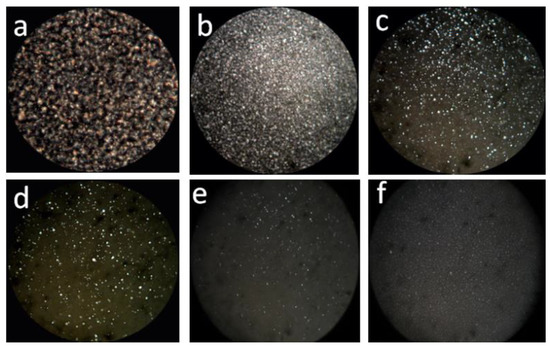 Figure 9. Spherulite morphology of (a) virgin PP, (bf) PP-H25 nanocomposites containing 1, 2, 3, 4 and 5 wt% GNPs respectively at 130 °C and 10× magnification.