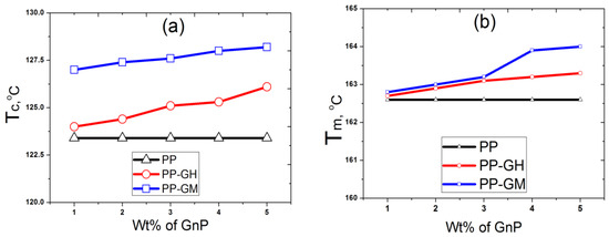 Figure 10. Variation of (a) crystallisation and (b) melt temperatures of the prepared nanocomposites with GNP content.