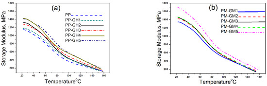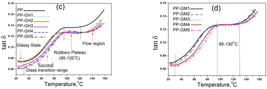 The effect of the GNP content on storage modulus and loss tangent (tanδ) of polypropylene was studied by conducting DMA. The experimental curves are shown in Figure 11. The tests were conducted starting from about 20 °C up to a temperature of 160 °C, which is very close to the melting temperature of PP. The literature reveals the glass transition temperature (Tg) to be in the range −20 to 0 °C [50]. Figure 11a,b shows an increase in storage modulus with GNP addition. As graphene is the stiffest material in nature, its reinforcement to PP increases the rigidity without changing the final processing temperature (because Tm does not change appreciably). The slope of the storage modulus curves almost constant up to 30 °C and represented the glassy state. There was a significant drop in storage modulus between 30 to about 90 °C (i.e., a sharp increase in tanδ). Within this temperature range, the nanocomposite behaviour is very similar to glass transition phase and may be called a relaxation phase or 2nd glass transition range, where the flow behaviour sharply changes. Regardless of GNP wt% the tanδ value did not vary within 95–120 °C (Figure 11c) for H25 and reflected the rubbery plateau phase. Beyond 120 °C, the flow region exists, but for PP/M25 nanocomposites, the rubbery phase existed between 95 and 130 °C. For an insight into the storage modulus and loss tangent, the extracted data corresponding to 60 °C are reported in Table 6. Both the properties increased linearly with GNP loading as much as the tensile modulus. Comparing Figure 11a,b, it is seen that the storage modulus of the nanocomposites made from H25 and M25 changed identically with temperature. However, the M25 GNPs are thinner and have a higher interfacial surface area, which helps the effective arrangement inside the PP matrix. This leads to efficient stress transfer from the PP chain to the filler [51,52]. M25 GNPs satisfactorily boosted the stiffness. For an instant, reinforcing 5 wt% M25 and H25 GNP increased the storage modulus of PP by 54% and 30%, respectively. Nanocomposites filled with H25 are less stiff and assists to form aggregates and clusters. This phenomenon prevents stress distribution and causes a noteworthy reduction in properties.