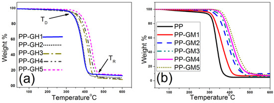 Figure 12. Thermogravimetric analysis (TGA) curves of PP composites incorporated with (a) H25 and (b) M25.