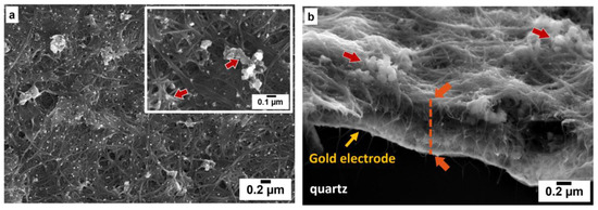 The SWCNT/PPy composite electrodes are prepared in a two-step process. In a first step, a thin layer of SWCNT is formed on the gold electrode of the quartz resonators by drop-casting a slurry containing SWCNT and PVDF-HFP as an active material and as a binder, respectively. The morphological characteristics of the SWCNT-modified QCM resonators were previously discussed [34]. Briefly, N2 adsorption analysis indicates that the SWCNTs have a pore diameter of 1–2 nm and a high specific surface area (~842 m2·g−1). Thin layers formed using these SWCNTs present a network of CNT bundles, made of at least ~10–20 CNTs [34]. In the second step, SWCNT-modified QCM resonators were used as a working electrode for the electropolymerization of pyrrole monomer, leading to the SWCNT/PPy composites. The surface morphology of SWCNT/polypyrrole (PPy) thin films was characterized by FEG-SEM, as shown in Figure 1. The images reveal a high-density of CNT bundles as it was already seen under the same film preparation conditions [34]. After two cycles (cyclic voltammetry) of PPy electrodeposition on the SWCNT-based electrodes, the formation of polypyrrole clusters with typical cauliflower or nodular morphology is observed in agreement with the previous studies [45], which is more evident on certain locations on the film surface (Figure 1a inset and Figure 2b, indicated with red arrows).