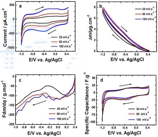 A small dependence on the scan rate values is observed in the EQCM responses, which is more pronounced in the the function is shown in Figure 2c. This result suggests that depending on the scan rate, different species may contribute to the electroadsorption and/or faradaic processes. Indeed, the information provided by the classical EQCM is insufficient for a thorough explanation of the transfer mechanism of the different species. As Ac-electrogravimetry was proven to be a strong complementary tool to EQCM in the previous CNT studies [32,33,34], the composite films were also analyzed with this technique. As mentioned earlier, this coupled tool can deliver unique species-selective and frequency-dependent information about the ion exchange mechanisms at the electrode/electrolyte interface.