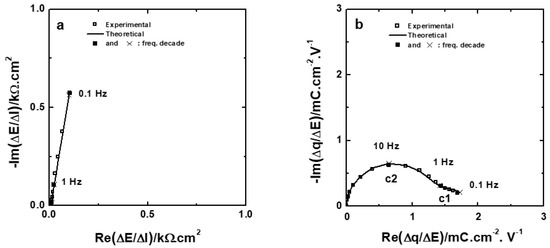 The experimental data of the electrochemical impedance, , and the charge/potential TF, , were fitted using theoretical functions given in Equations (A1) and (A2). It is considered here that only two ions, c1 and c2, are involved in the charge compensation process.