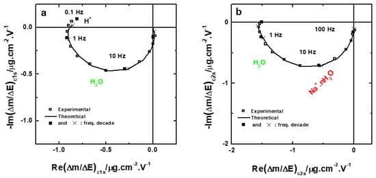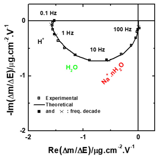 In the mass/potential transfer function, , one big loop appears in the third quadrant (Figure 4), which is characteristic for cation/solvated cation contributions or free solvent molecules in the same flux direction. In the fitting process of the experimental , three species are considered: Na+.nH2O at higher frequencies, free H2O molecules at intermediate frequencies and H+ at lower frequencies. The identification of these species was achieved by the determination of their molar mass, Mi, using Equation (A3) given in the theoretical part of Appendix A. The two parameters Ki and Gi, were already given by the electrochemical response for the two ionic species. For the free solvent, Ks and Gs are only estimated through the mass/potential transfer function, .