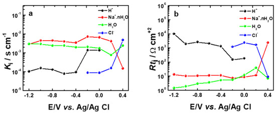 Figure 6a,b display how the kinetic transfer rates, Ki, and the transfer resistance, Rti, of the species evolve as a function of the applied potential. The potential range corresponds to the conditions where the electroadsorption/desorption or insertion/expulsion processes of the thin film can be observed. The Ki values presented in Figure 6a indicate that the Na+.nH2O ion is the fastest of the four species. This observation may be correlated to an easier dehydration process of the sodium species compared to the protons. For the latter ions, it is noted that their corresponding interfacial transfer occurs at low frequencies. Additionally, the concentration of the protons in the electrolyte is much lower compared to that of sodium species at this pH value.