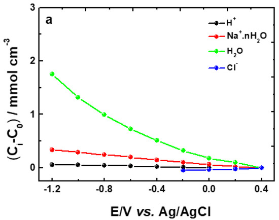Figure 2c shows the function calculated from the EQCM data as a function of potential, which is equivalent to the global molar mass of the species obtained from the reduction branch in the range from 0.4 V to −1.2 V vs. Ag/AgCl in 0.5 M NaCl. At the cathodic potential region, the values vary in the range of 50–200 g·mol−1, which could correspond to Na+ with a high number of hydration or Na+ accompanied by free solvent molecules. However, at the anodic potentials, the values are smaller, and they vary in the range 0–50 g·mol−1, which is also difficult to be attributed to a single ion contribution (i.e., 23 g·mol−1 and 35 g·mol−1, for Na+ and Cl−, respectively). Unfortunately, using EQCM alone to understand the interfacial process appears to be limited in the present case because the charge compensation can also be due to the concomitant insertion of anions or to solvated cations or to a mixture of these species. Dynamic approaches have the potential to reach a fair separation of these processes (identification by the kinetic transfers). For this reason, Ac-electrogravimetric investigations were performed to complement the EQCM and will be discussed in Section 3.3.