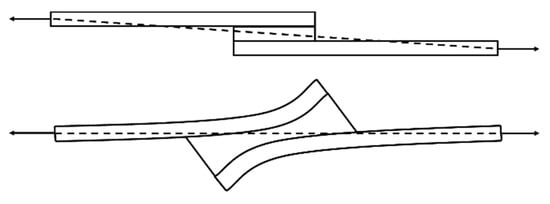 Another complication with single-lap shear joints is the eccentricity in the load path, which causes bending and normal forces in the adhesive zone, referred to as peeling forces (Figure 2). In the case of a joint with metal adherends, these forces would result in adhesive peeling. However, with FRP adherends the inter-laminar tensile strength is significantly lower than the peel strength of structural adhesives, and these peel forces often lead to failure caused by the delamination of the composite fiber layers [10]. As an approach to overcome the drawbacks of single-lap shear testing, double-lap shear joints have been used. Although the bending moment is minimized, it has been found that adherends still experience internal bending [11,12]. Because of these effects, the failure observed in FRP lap shear testing is rarely associated with the failure of the adhesive in shear.