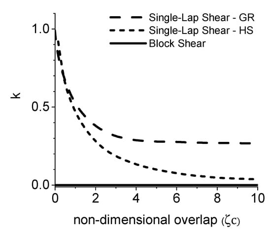 Next, considering the block shear specimen, the conditions of the experimental set-up constrict the faces of the adherends with the compression fixture. This essentially eliminates any of the out-of-plane bending and reduces the eccentricity to zero. The two analytical models for single-lap shear are compared to block shear in Figure 5. The eccentricity decreases for both the GR and HS models, with an increase in the non-dimensional overlap term , though only the HS model reduces to zero and is more accurate when observing eccentricity in bonded materials where the adherend has a much higher stiffness than the adhesive.