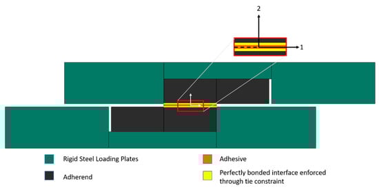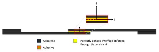 The model was generated with dimensions as per ASTM D5868 [13]. Second order plane strain elements (CPE8R) were used to mesh the adherends and the adhesive material with four elements in the through-thickness direction to achieve convergence. This resulted in an element edge length of 0.25 mm. The bonding between the adhesive and adherends was assumed to be perfect, and a tie-constraint was imposed between the two, as shown in Figure 6.