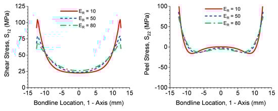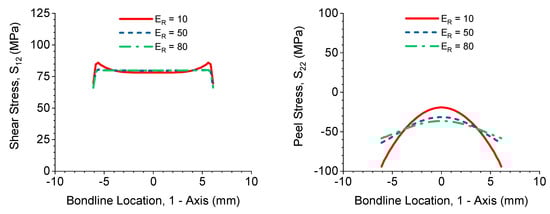 The results of the finite element analysis confirm what was predicted with the discussion of analytical models in Section 2. Shear and peel stresses for the single-lap shear geometry are shown in Figure 10 comparing different adherend-adhesive modulus ratios (). Shear stresses at the bondline edge are higher than at the center due to the differential shear, as discussed previously. The peel stresses are also significantly higher at the bondline edge than in the center of the bond. This effect is responsible for the delamination in FRP adherends, and demonstrates the difficulty with making conclusions about bond quality in such joints using this geometry. Trends are also visible with increasing . A higher adherend modulus reduces edge-bending and produces a more consistent shear stress along the bondline and reduces the peel stress at the edges.