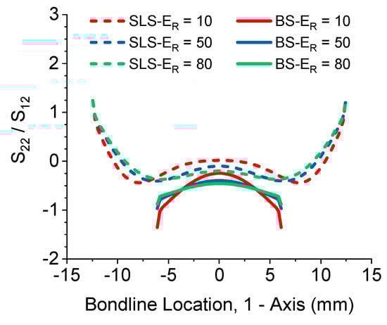 A parametric study was performed to understand the effect of moduli of the adherend and adhesive on the peel and shear stresses at the bond line. The ratio between the Young’s modulus of the adherend and the adhesive, or was used as a metric to study this. The adhesive was assigned a typical Young’s modulus of 3.0 GPa [6] and the adherends were assigned Young’s modulus values of 32.8 GPa [20] for a representative glass fiber composite and 145 GPa and 230 GPa for a low-modulus and high-modulus carbon fiber composite, respectively [21]. The resulting modulus ratio values were approximated as = {10, 50, 80}. The ends of both adherends were fixed in the 2- direction, with one adherend fixed in the 1- direction and the other adherend having a force of P = 1000 N applied to the end face. Tab geometries were added to the ends of the adherends to replicate the ASTM test procedure and maintain in-line displacement. A local coordinate system was generated to follow the nodal displacements, where the origin was centered in the adhesive and the 1- direction was along the bond line, instead of the global 1- or loading direction. This allowed for the generation of shear (S12) and peel (S22) stresses along the bondline.