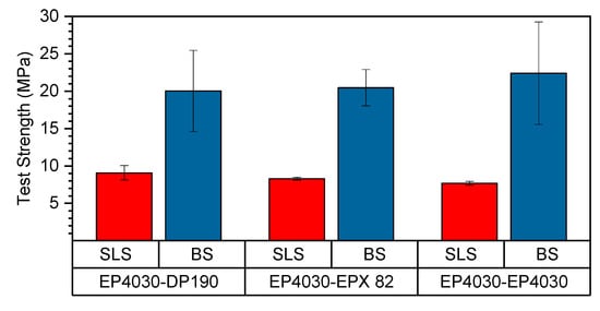 Comparison between single-lap shear (SLS) and block shear (BS) test results for the three different bonding materials.