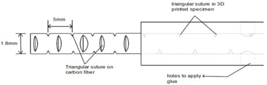 Solid carbon fiber (CF) rod and 3D printed specimen with triangular interlock sutures.