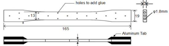 A tensile specimen of pure PLA was designed with 3D modeling software and converted into STL format. The fabrication was initiated with reference process parameters that were chosen from various literatures. For the printing of pure PLA specimen, process parameters such as raster angle of 45° and horizontal build orientation [33] were kept constant throughout the experiments as per ASTM D638-10 tensile test specimen, as shown in Figure 2. To increase the tensile strength of the fabricated reference sample, bioinspired solid CF rods of diameter 1.8 mm was reinforced manually into the three holes provided in the specimen. The inner surface of the holes was projected with a triangular suture. The interface bonding between the PLA and the CF rods were improved by applying adhesive (cyanoacrylate) through the holes exactly above the path of the solid CF rods. The process parameters mentioned in Table 2 were used to fabricate the pure PLA tensile specimen.