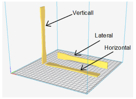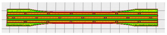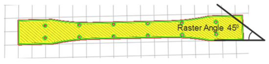 If the thickness of the tensile specimen is 3 mm, the diameter of the solid CF rod should be less than 3 mm. At the same time, it should occupy more than 50% of the thickness of a tensile specimen in order to enhance the tensile strength and triangular suture characteristics. Solid CF rods are available in different diameters, but based on the above criteria, a rod diameter of 1.8 mm, or 60% of the tensile specimen value, was selected. The plain solid CF rod was preprocessed by a triangular file with 60° angle to generate triangular interlock sutures over the surface with a regular interval of 5 mm. Next, the solid CF rod was inserted into the tensile specimen hole with the help of a plastic mallet (interference fit). The linear and angular movement of the solid carbon rod was arrested by pouring the glue into the holes on the tensile specimen surface as well as in the 1.8 mm hole. The bonding strength between the CF rod and the pure PLA tensile specimen was ensured by a bonding agent (cyanoacrylate). The flow ability of the bonding agent was higher and covered the whole inner surface of the tensile specimen. Hence, no other external force was needed to increase the bonding strength. The layer view of solid CFRPLA is presented in Figure 3. Figure 4 represents the raster angle of 45°, and Figure 5 illustrates the types of built orientation for fabricating tensile specimens.