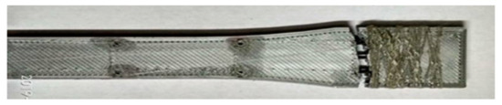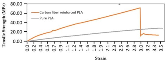 After the fabrication of pure PLA, it was employed with the CF rod using the binding agent. The tensile strength was measured to understand the mechanical behavior of PLA employed with the CF rod. The Autograph AG-Is 50 KN machine was used for the tensile test. The tensile test for the specimen was carried out gradually at a jaw speed of 0.4 mm/s until the specimen broke. An extensometer was employed to measure the strain. The tensile test was performed to measure the tensile strength of the reference sample and compare it with the pure PLA sample, as shown in Figure 6. The results showed that the tensile strength of bioinspired solid CF rod reinforced FDM samples was 2.5 times superior to 3D printed pure PLA samples. The Young’s modulus (tensile modulus) of the CFRPLA was 2.5 to 4 times higher than the plain PLA based on the stress–strain curve. Figure 7 shows the CFRPLA tensile specimen after the tensile test. To maximize the tensile strength of 3D printed components and determine the detailed relationship between each parameter and the tensile characteristics of specimens, a trial and error method was followed.