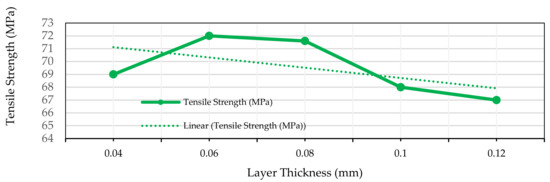The effect of layer thickness was evaluated by fabricating five different samples of varying layer thickness ranging from 0.04 to 0.12 mm, as specified in Table 3. In the reference sample, the layer thickness was kept as 0.08 mm referring to the literature. In addition, two upper and two lower values with intervals of 0.02 mm were used. While fabricating the samples, the other four parameters were kept constant as mentioned in the reference sample. As shown in Figure 8, the sample printed with a layer thickness of 0.06 mm had the maximum tensile strength. From the above result, it can be concluded that the optimum layer thickness 0.06 mm would give the highest tensile strength for CF rod reinforced 3D printed samples.