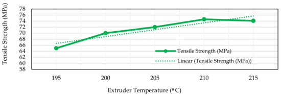 The effect of extruder temperature was investigated by fabricating five different samples with extruder temperature ranging from 195 to 215 °C, as specified in Table 4. In addition to the sample specimen extruder temperature 205 °C, two upper and two lower values with intervals of 5 °C were used. While printing the samples, the previously obtained optimum layer thickness of 0.06 mm was used, and the remaining three parameter values mentioned in the reference sample were kept constant. As shown in Figure 9, the sample printed with the extruder temperature of 210 °C resulted in the highest tensile strength. From the above result, it was concluded that the optimum extruder temperature of 210 °C would give the highest tensile strength compared to the other extruder temperatures.