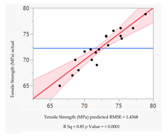 From the above relationship between the tensile strength of predicted value vs. actual value, the R2 value of tensile strength was found to be 0.85. A p-value < 0.0001 was used to indicate the significance and influence of process parameters on the tensile characteristic of CFRPLA. The plot between actual tensile strength vs. predicted value is shown in Figure 12.
