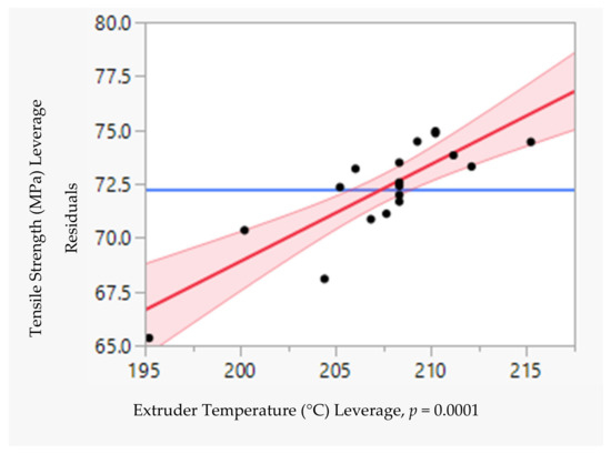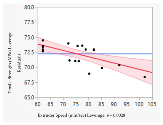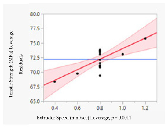 The influence of each parameter on the tensile strength of CFRPLA was evaluated by a leverage plot. The p-value of each parameter revealed how the parameter influenced the tensile strength.