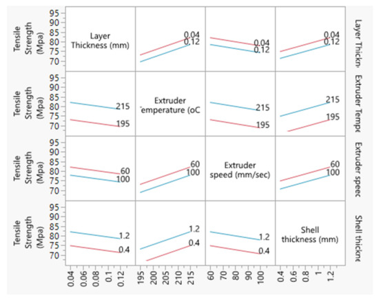 - The interrelationship between the process parameters influencing the tensile strength of the CFRPLA specimen is exhibited in the interaction plot in Figure 17.