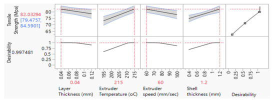 From the experimental results, the maximum tensile strength of 78.8 MPa was obtained by maintaining the optimum process parameters values, i.e., layer thickness of 0.06 mm, extruder temperature of 210 °C, extruder speed of 60 mm/s, and shell thickness of 1.2 mm. From the desirability plot shown in Figure 18, the maximum tensile strength that could be obtained was 82.03 MPa using the following process parameters values: layer thickness of 0.04 mm, extruder temperature of 215 °C, extruder temperature of 60 °C, and shell thickness of 1.2 mm. It was observed that maintaining a minimum layer thickness and increasing the number of layers increased the density and also enhanced the bonding strength between the layers of PLA. The maximum extruder temperature of 215 °C and the minimum extruder speed of 60 mm/s increased the curing time and stabilized the printed layer in order to receive further material deposition over it. The maximum shell thickness of 1.2 mm provided protection against external loads over the printed layers, which maximized the tensile strength of CFRPLA.