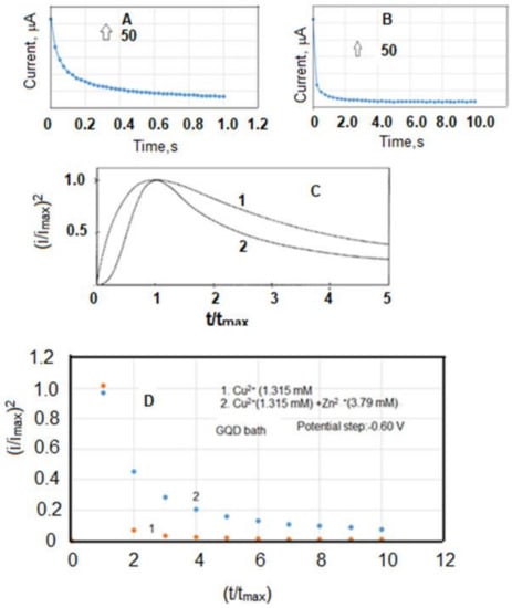 Notice that Equations (2) and (3) differ in the constants in front and suggests a higher value for the progressive nucleation. In the present work, the current–time transients were used to examine the change in multiple nucleation. Table 3 shows the measured currents of the current–time transients in the potentiodynamic electrolysis. As the concentration ratio of zinc to cupric ion in the bath increased, the value of i2 maxtmax decreased. This situation corresponds to the deposition of both copper and zinc in the electrolysis. Examining this behavior with the modelled predictions shown in Table 3 and Figure 2 suggests a change in the mechanism from instantaneous to progressive nucleation, as the diffusion coefficients of the copper and zinc ions are nearly the same (Dcu = 5.83 × 10−6 cm2/s [79] and Dzn = 1.18 × 10−5 cm2/s), and both undergo a two electron reduction during electrolysis. These results suggest that there is an interaction between graphene and the metal atoms, as predicted by Adamska et al. [80] through density functional theory calculations. Interestingly, the above behavior of change in nucleation mechanism is observed in the experiments carried out with and without zinc ions in the medium during deposition of copper in the GQD bath. Figure 2 shows the plot of (i/imax)2 vs (t/tmax) with zinc ion present in the GQD bath; if a cupric ion reduction occurs as a progressive nucleation mechanism, the presence of the zinc ion changes it more towards instantaneous mechanism in comparison to the theoretical model described by Figure 2D. The measured currents are corrected for charging currents by using the background electrolyte electrolysis.