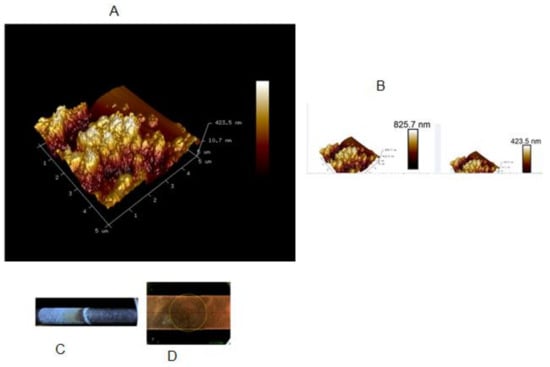 The deposited samples have been analyzed for qualitative analysis of surface morphology. Figure 3 gives the observed features of one AFM image of the electrodeposited brass with a high carbon content. The surface appears to have features that are possibly clusters of deposited material. The maximum roughness (Rmax) is calculated by the difference of the highest peak height above the mean line and depth of the deepest valley below the mean line. The Rmax was 834 nm, with the distribution depicted in the figure. The roughness arithmetic average (Ra) of height deviation was 115 nm. The deposits have a compact distribution all over the substrate; a scanning electron microscopy examination further confirmed this discussion (see Supplementary Materials S6).