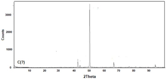 The electrochemical deposit of the alpha brass has been reported on steel substrate [22], which showed a peak at 2θ = 43°, corresponding to CuZn (111) with d = 2.096 A°. This deposition required the ionic liquid choline acetate. The XRD features of the laser peeling brass showed the (111), (200), (220), and (211) phases [81]; this material had an ultimate strength of 372 MPa, yield strength of 230 MPa, and with negligible fatigue fracture. The XRD pattern of the brass that has been subjected to carbon irradiation showed reflections at 41.7°, 42.6°, 48.59°, 62.46°, 71.62°, and 78.03° due to the (320), (111), (202), (600), (312), and (102) plane reflections, respectively [82]. In the ion flux ranging 56 × 1012 to 26 × 1013 ions/cm2, the XRD features have not shown any significant changes. The alpha and beta brasses were examined by XRD after electro polishing [83]. The “a” brass showed distinct peaks corresponding to (111), (200), (220), (311), and (222) and “b” brass showed reflections at (110) and (220). The electrodeposited Cu-Zn in alkaline solutions with D-Mannitol has been examined by XRD for the phases and morphology of the surface [84]. The XRD of the nanobrass, CuZn5, showed 2θ = 37.64°, 42.22°, 43.21°, 57.69°, 68.05°, 77.82°, and 83.27° [85]. The electrochemical deposition of the composite (Figure 4) shows similar 2θ features at 43.64°, 45.00°, 50.83°,65.47°, 74.75°, and 90.64°, with no reflection coming from carbon. The features observed with the present composite are nearly identical to that reported by Atay et al. [86,87,88,89] for the microstructure of brass alloys of the type Cu3.8Zn0.2 (low zinc content). Interestingly, the XRD features fit those of the face-centered copper cubic phase (JCPDS, copper file No. 04–0836 ASTM 03-1005 face-centered copper cubic phase) and zinc (JCPDS-00-004-083). The absence of carbon led us to examine in the literature whether the carbon insertion into metals are characterized by XRD. For example, in steel, where carbon is inserted into an iron atom the reflections from the different planes of the iron atom are reported with no carbon reflection visible. The new alloy does show 2θ reflections due to the composite indicating that the carbon is shielded in the structure. Since the Raman imaging (see Figure 5) shows the characteristic peaks due to the D and G band along with copper, it appears that the graphene planes are inserted into the composite.